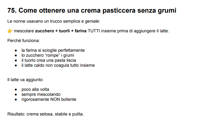 Leggendo questi segreti mi sono commossa. Alcuni li conoscevo, altri li avevo completamente dimenticati, ma tantissimi non li avevo mai sentiti. È come avere una nonna in cucina che ti guida passo per passo. Bellissimo.