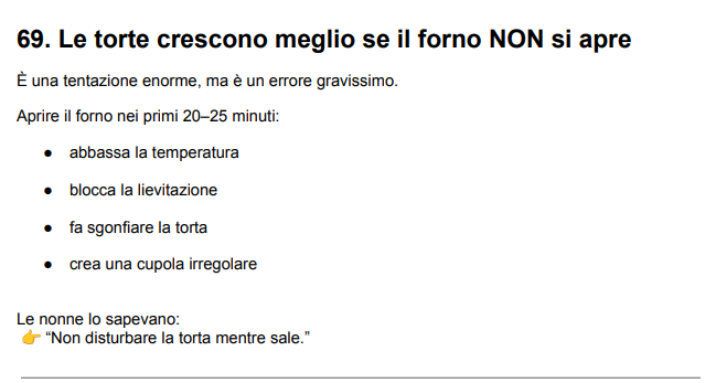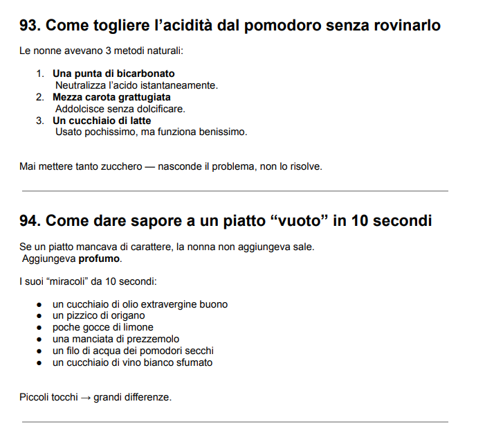 Leggendo questi segreti mi sono commossa. Alcuni li conoscevo, altri li avevo completamente dimenticati, ma tantissimi non li avevo mai sentiti. È come avere una nonna in cucina che ti guida passo per passo. Bellissimo.